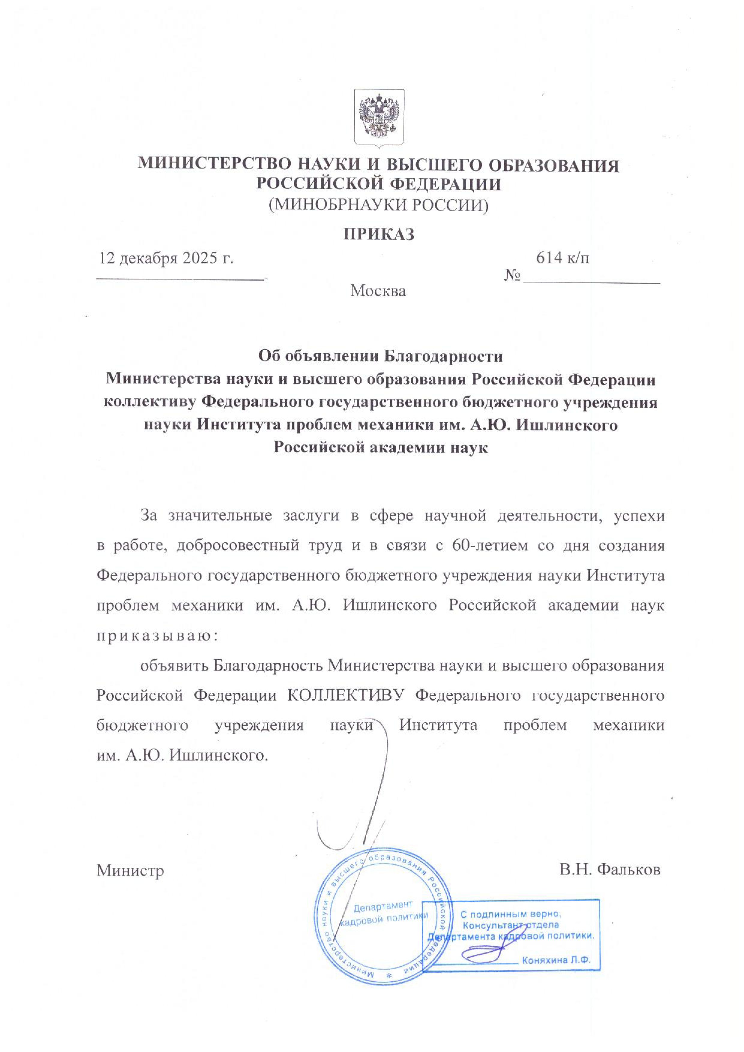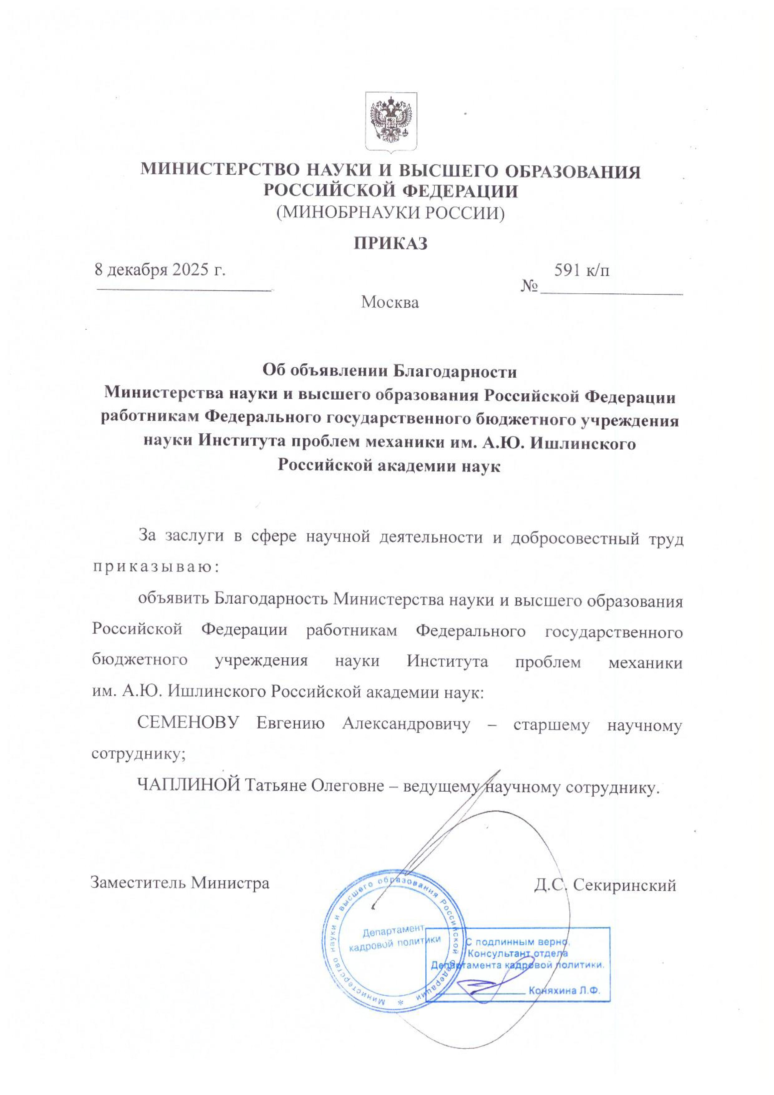 12.12.2025 Благодарность от Минобрнауки России За значительные заслуги в сфере научной деятельности,