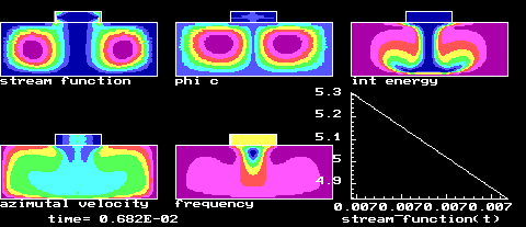 Vibration and Heat Convection in Czochralski Crystal Growth. The cold growing crystal is situated in the centre of the upper boundary. The bpttpm and the wall of the cylindrical crucible are hot. The crystal is harmonically vibrating in vertical direction. The vibrations level the distribution of a temperature in the crucible decrease the width of boundary layers. This features can have useful influence on a quality of growing crystals. The task is solved with Dr. A.I.Fedyushkin using code ASTRA in 2000.